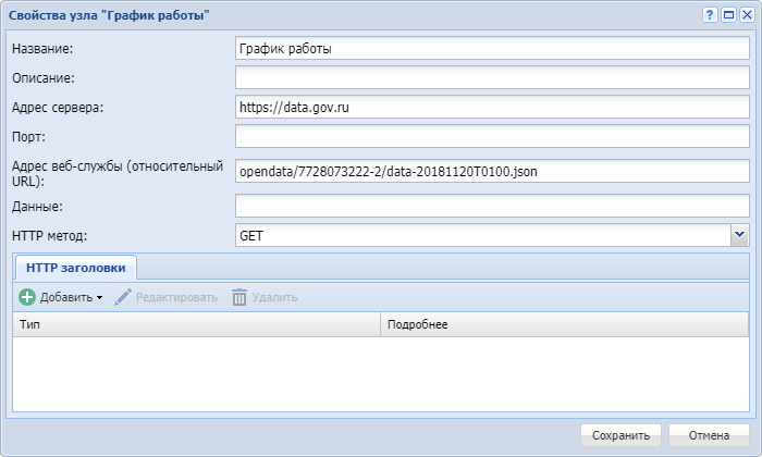 У узла Веб-служба REST/JSON установим название "График работы" и настроим свойства.