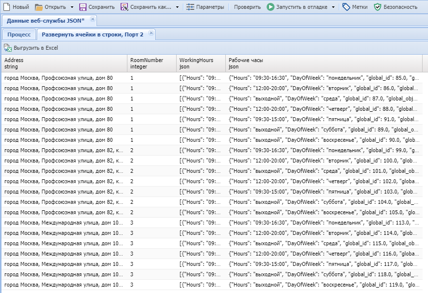 - Запустим процесс в отладке для просмотра результатов узла "График работы и адреса обслуживания".