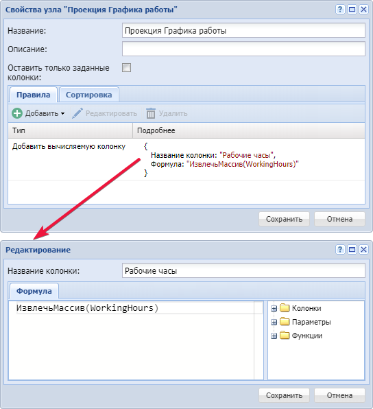 - У узла Проекция установим название "Проекция Графика работы", настроим свойства и добавим вычисляемую колонку "Рабочие часы".