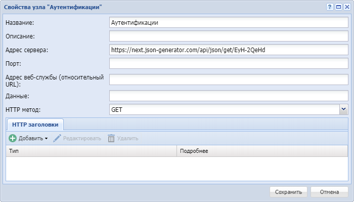 Для этого добавим узел Веб-служба REST/JSON, установим название "Аутентификация" и настроим свойства.