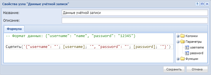 - У узла Формула установим название "Данные учётной записи" и настроим формулу с использованием параметров процесса.