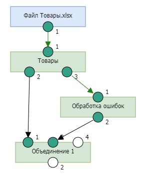 - Для объединения данных без ошибок и данных с обработанными ошибками добавим узел Объединение и соединим его первый входной порт с выходным портом 2 узла "Товары", из которого выходят данные без ошибок, и соединим второй входной порт узла "Объединение" с выходным портом узла "Обработка ошибок", из которого получены данные с обработанными ошибками.